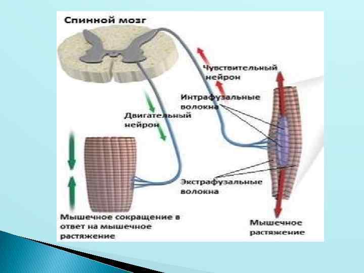 Рефлекторная активность организма Рефлекс растяжения (стреч – рефлекс) – возникает в ответ на растяжение мышцы, мышцы сокращается Сухожильный рефлекс (рефлекс аппарата Гольджи) – возникает в ответ на напряжение мышцы, мышца расслабляется. Растягивать мышцу до активизации рефлекса растяжения