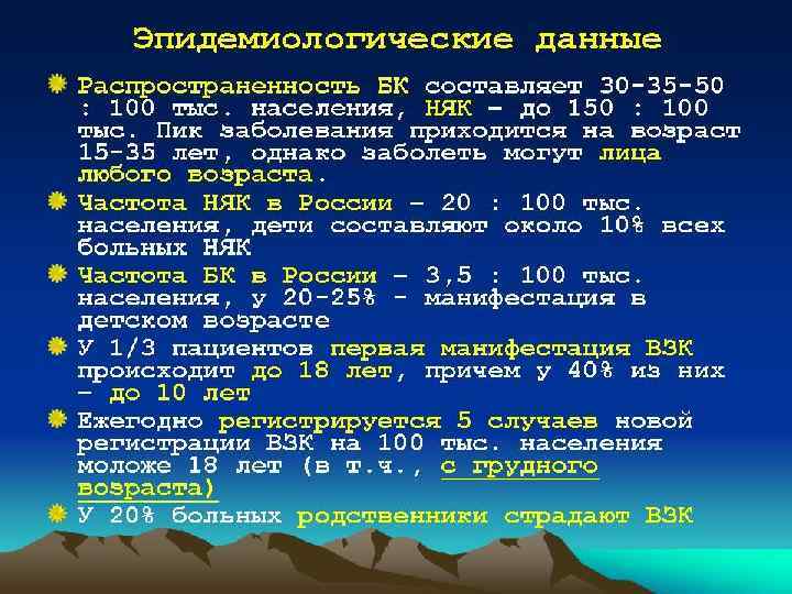 Профилактика • Профилактика - предупреждение рецидивов. • После выписки из стационара всем больным следует рекомендовать курсы поддерживающего и противорецидивного лечения, включающего базисную медикаментозную терапию, диету и охранительновосстановительный режим. • Больные неспецифическим язвенным колитом подлежат обязательному диспансерному наблюдению. • Профилактическую вакцинацию проводят только по эпидпоказаниям ослабленными вакцинными препаратами. • Детей освобождают от экзаменов, физических нагрузок (занятий физкультурой, трудовых лагерей и т. д. ). Обучение желательно проводить на дому.