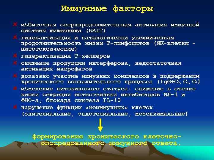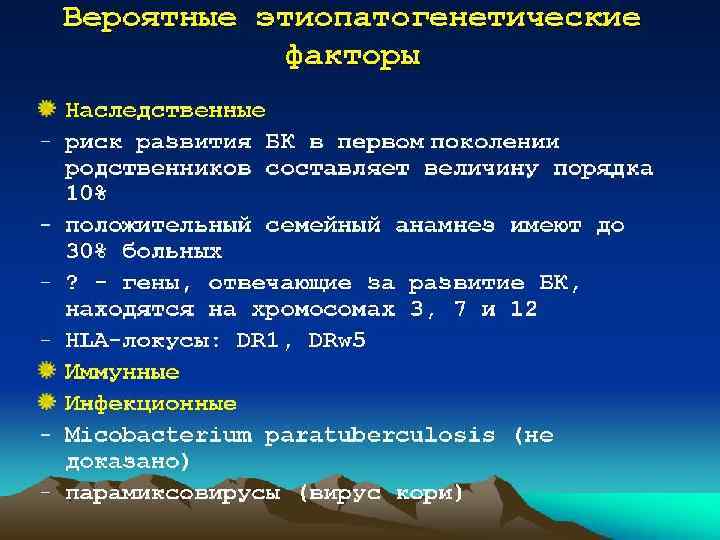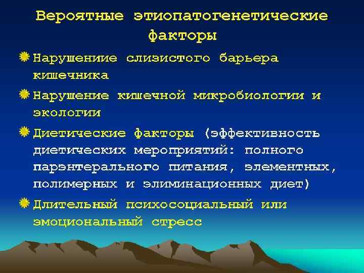 Этиология и патогенез • этиология заболевания остаётся невыясненной. • Теории- инфекционная, психогенная и иммунологическая. • триггеры -вирусы, бактерии, токсины, некоторые ингредиенты пищи, способные вызвать начало патологической реакции, приводящей к повреждению слизистой оболочки кишки. • Большое значение придают состоянию нейроэндокринной системы, местной иммунной защите слизистой оболочки кишки, генетической предрасположенности, неблагоприятным факторам внешней среды, психологическим стрессам, ятрогенно-медикаментозным воздействиям. • При неспецифическом язвенном колите возникает каскад самоподдерживающихся патологических процессов: сначала неспецифических, затем аутоиммунных, повреждающих органы-мишени.