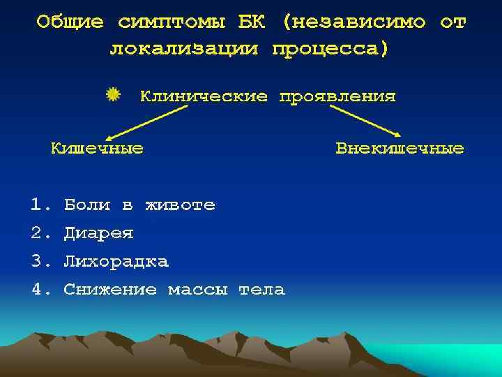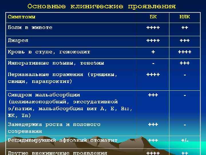 Клиническая картина • диарея, выделение со стулом крови, боли в животе. • Почти в половине случаев заболевание начинается исподволь. • При лёгком колите заметны единичные прожилки крови в стуле, при тяжёлом - значительная её примесь. Иногда стул приобретает вид зловонной жидкой кровавой массы. • частота стула варьирует от 4 -8 до 16 -20 раз в сутки и более. В жидком стуле помимо крови содержатся в большом количестве слизь и гной. • боли в животе, чаще во время еды или перед дефекацией. Боли схваткообразные, локализуются внизу живота, в левой подвздошной области или вокруг пупка. Изредка развивается дизентериеподобное начало болезни. • повышение температуры тела (обычно не выше 38 °С) • снижение аппетита • общая слабость • снижение массы тела • анемия • задержка полового развития.
