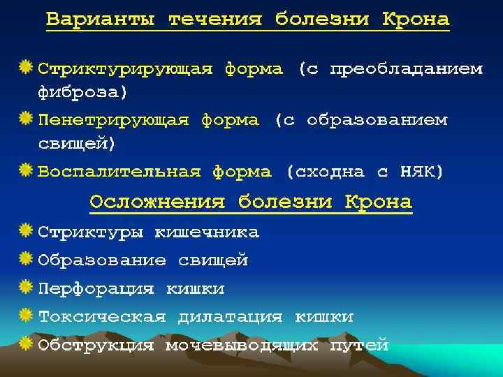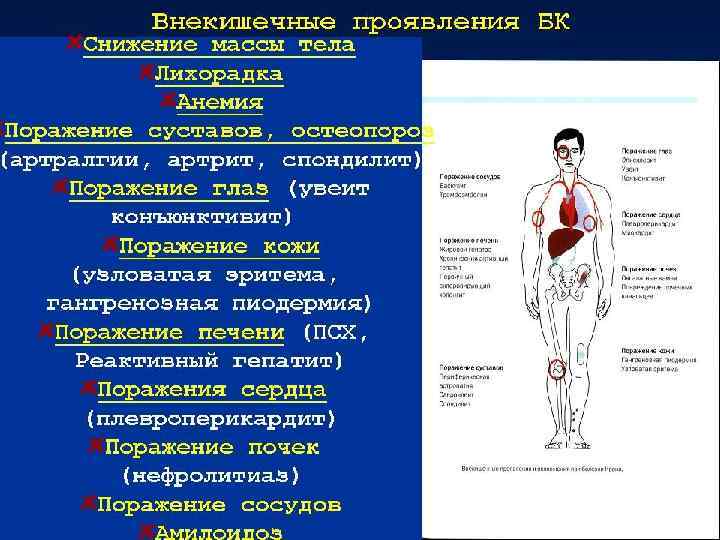 Осложнения • системными и местными. • Системные осложнения многообразны: артриты и артралгии, гепатиты, склерозирующий холангит, панкреатиты, тяжёлые поражения кожи, слизистых оболочек (узловатая эритема, пиодермии, трофические язвы, рожистое воспаление, афтозный стоматит, пневмония, сепсис) и глаз (увеит, эписклерит). • Местные осложнения у детей развиваются редко. К ним относят профузное кишечное кровотечение, перфорацию кишки, острую токсическую дилатацию или стриктуру толстой кишки, поражение аноректальной области (трещины, свищи, абсцессы, геморрой, слабость сфинктера с недержанием кала и газов), рак толстой кишки.