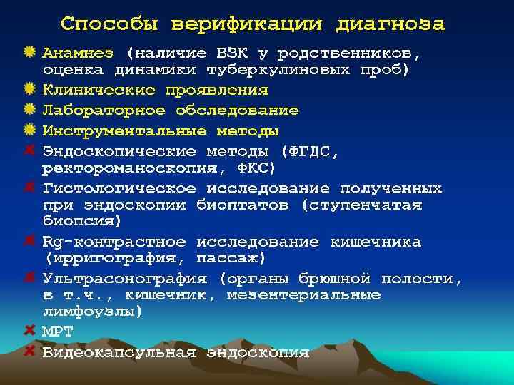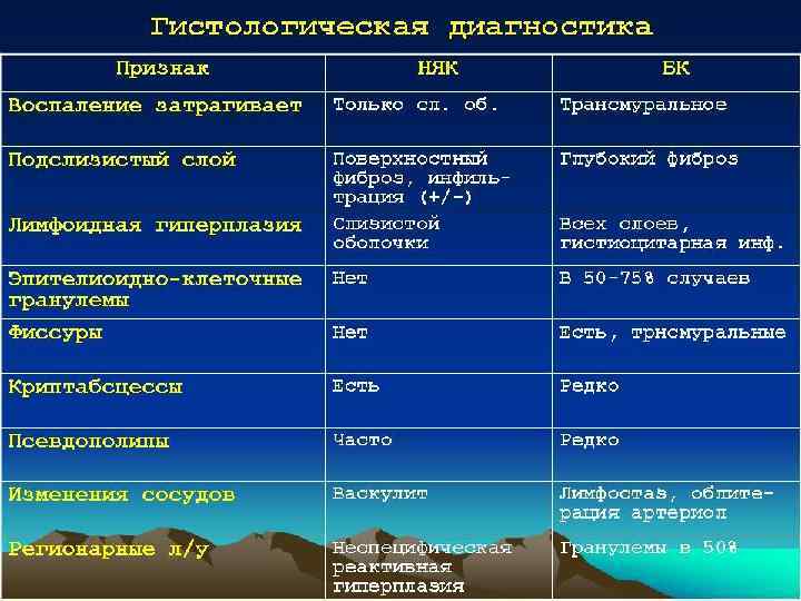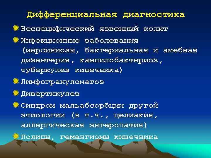 Диагностика и дифференциальная диагностика • Диагноз устанавливают на основании клинико-лабораторных данных, результатов ректороманоскопии, сигмо- и колоноскопии, ирригографии, а также гистологического исследования биопсийного материала. • Дифференциальную диагностику проводят с болезнью Крона, целиакией, дивертикулитом, опухолями и полипами толстой кишки, туберкулёзом кишечника, болезнью Уиппла и др.
