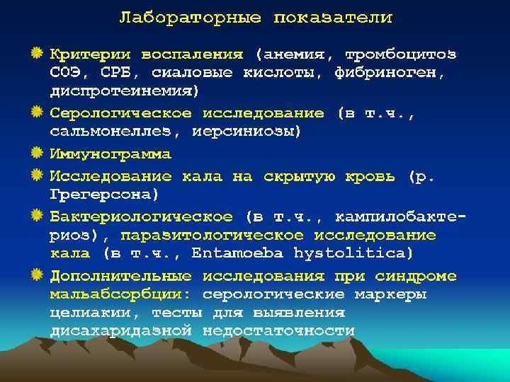 Лабораторные исследования • При анализе крови обнаруживают лейкоцитоз с нейтрофилёзом и сдвигом лейкоцитарной формулы влево, снижение содержания эритроцитов, гемоглобина, сывороточного железа, общего белка, диспротеинемию со снижением концентрации альбумина и повышением у-глобулинов; возможны нарушения электролитного состава крови. Соответственно остроте и фазе заболевания повышаются СОЭ и концентрация Среактивного белка