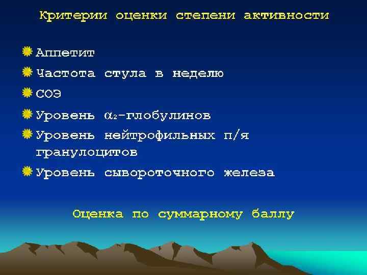 Рабочая классификация неспецифического язвенного колита локализация Активность течение фаза Степень Дистальный колит Левосторонний колит Тотальный колит Внекишечные проявления и осложнения Минимальная Умеренная Резко выраженная Молниеносное Острое Хроническое • рецидивирующе е • непрерывное Ремиссия Обострение Легкая Средней степени Тяжелая