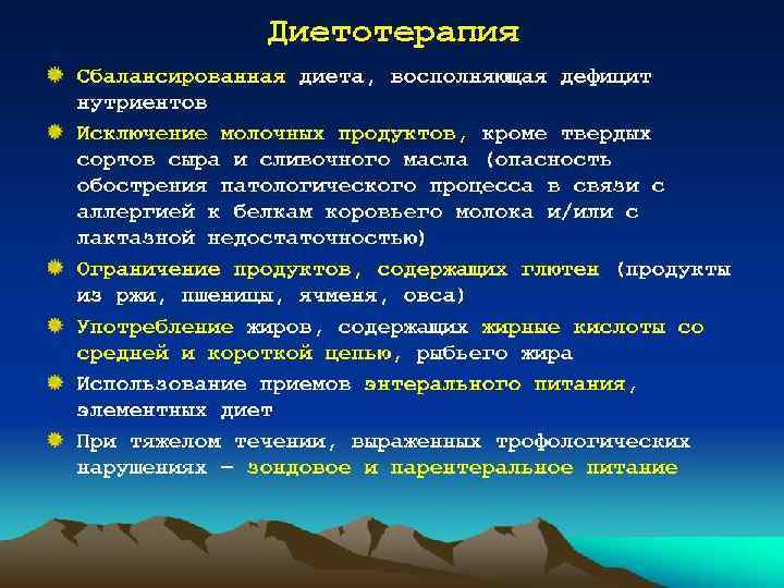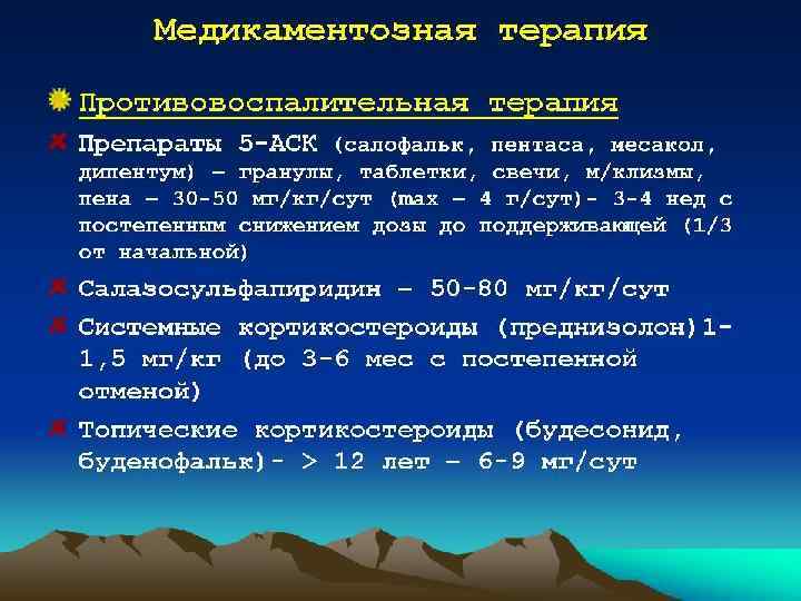 Лечение • диета. Назначают безмолочный стол № 4 по Певзнеру, обогащенный белком за счёт мясных и рыбных продуктов, яиц. • базисная терапия - сульфасалазин и препараты 5 аминосалициловой кислоты (месалазин). Их можно принимать через рот и вводить в виде лечебных клизм или свечей в прямую кишку. Дозу препаратов и длительность лечения определяют индивидуально. При тяжёлом течении неспецифического язвенного колита дополнительно назначают глюкокортикоиды. По строгим показаниям применяют иммунодепрессанты (азатиоприн). Проводят также симптоматическую терапию и местное лечение (микроклизмы). • Альтернативой консервативному лечению служит оперативное - субтотальная резекция кишки с наложением илеоректального анастомоза