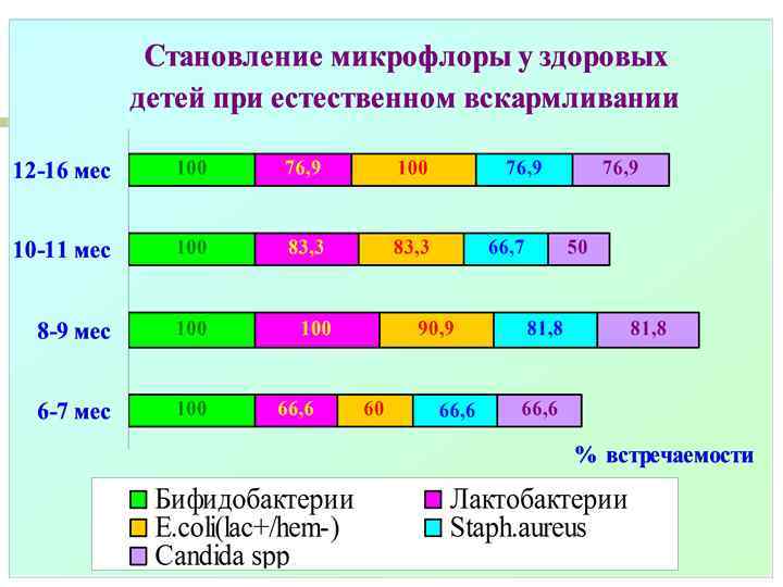 Возрастная динамика условно патогенной микрофлоры при естественном вскармливании 12 -16 мес 23, 1 10 -11 мес 8 -9 мес 6 -7 мес 23, 1 7, 715, 4 61, 5 83, 3 36, 4 46, 6 100 33, 3 16, 7 27, 3 9, 1 90, 9 53, 3 33, 3 13, 3 20 Ecoli(lac+/hem+) Enterobacter cloacae Pseudomon. aerug. % встречаемости Клебсиеллы (общ) Citrobacter freund.