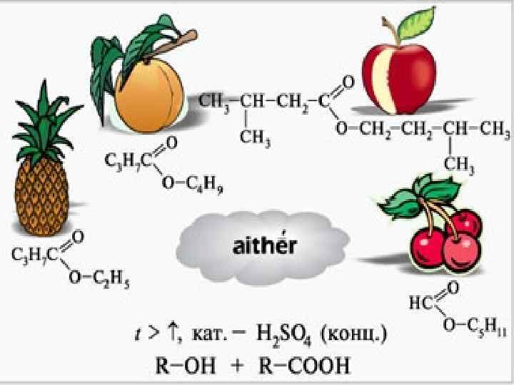 Сложный эфир - запах • • • этилбутират – ананас, бутилбутират – персика, пентилформиат – вишни, изопентилацетат – груши, этилбензоат – жасмина, изоамилоизовалерианоат – яблока.