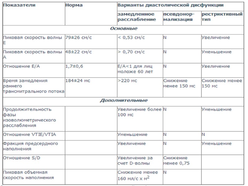 В норме типичные показатели митрального кровотока в диастолу имеют два пика: волна Е и волна А. Первая отражает раннюю (Е) фазу заполнения ЛЖ, вторая — предсердный (А) компонент диастолического заполнения ЛЖ. В качестве основных критериев используются также отношение Е/А и время замедления раннего трансмитрального потока. При необходимости определяются дополнительные показатели, такие как продолжительность фазы изоволюметрического расслабления, фракция предсердного наполнения, отношение VTIE/VTIA, отношение S/D и др. При нарушении диастолической функции ЛЖ эти показатели изменяются