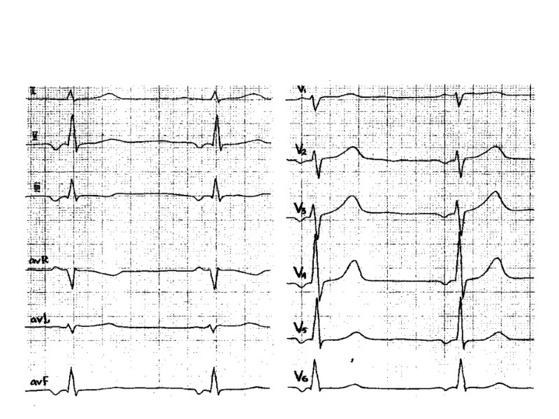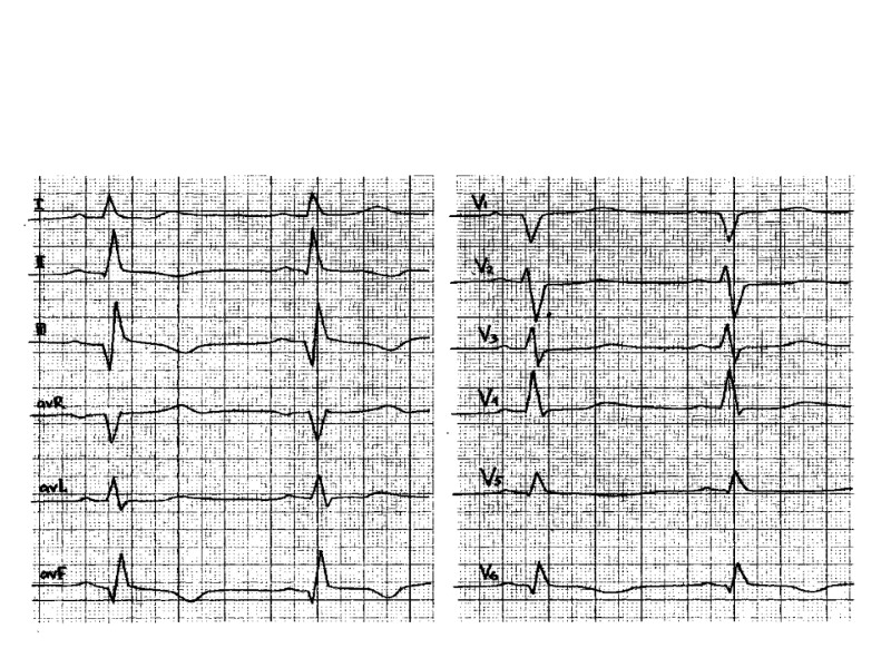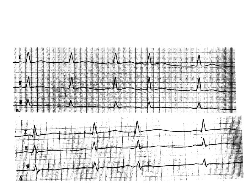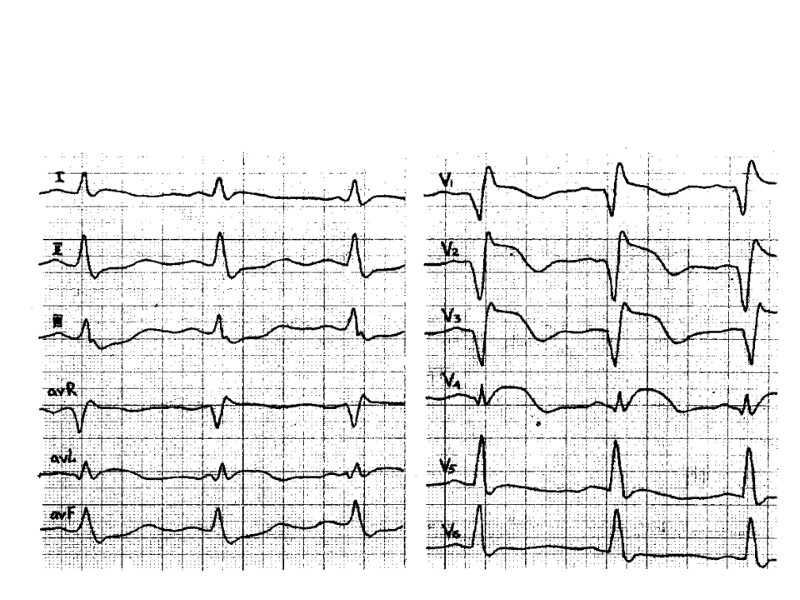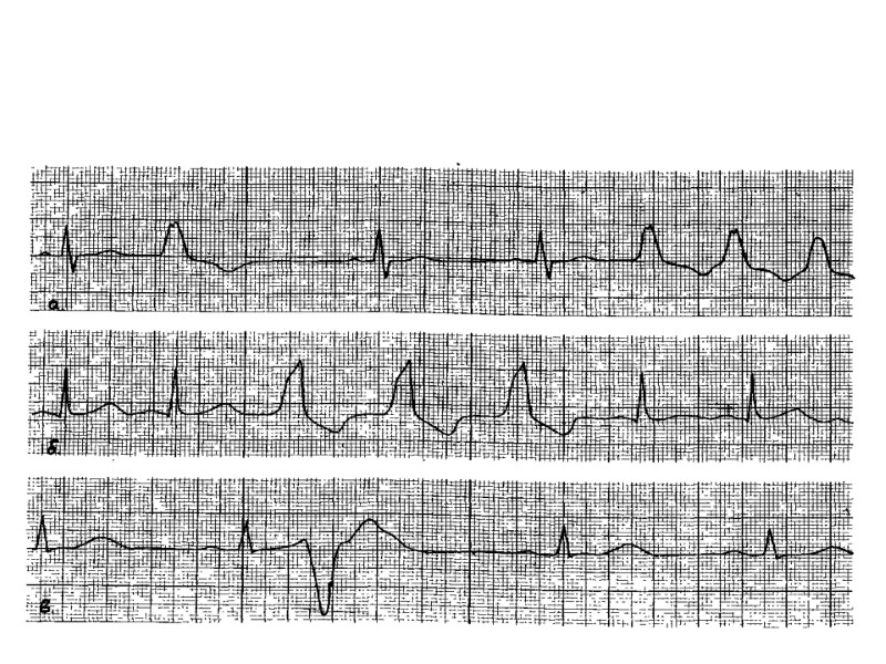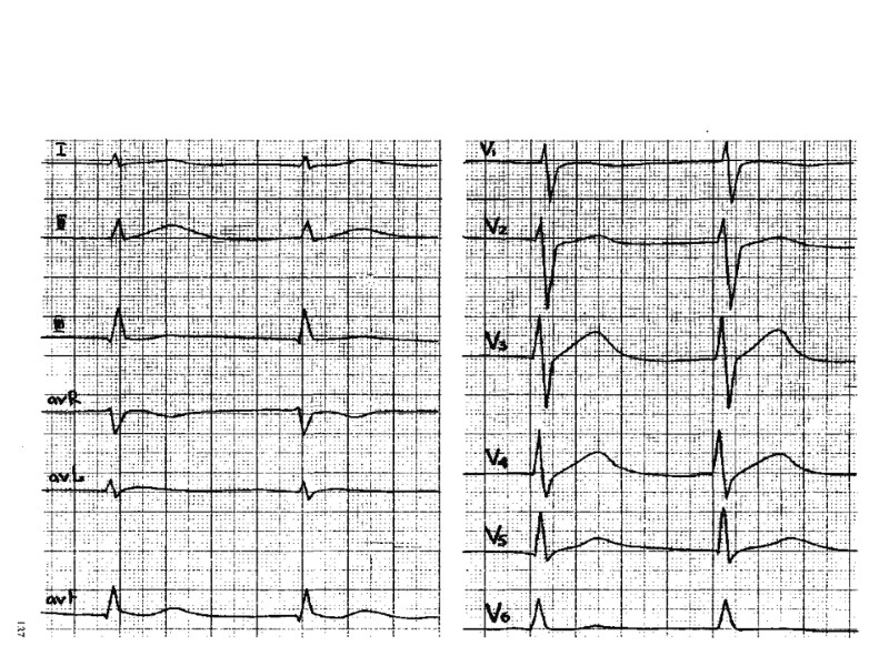 Показания к прекращению пробы 8. Подъем сегмента S—Т более чем на 1 мм. 9. Появление угрожающих нарушений ритма (частая или политопная желудочковая экстрасистолия, пароксизмальная тахикардия, мерцательная аритмия). 10. Появление нарушения атриовентрикулярной и внутрижелудочковой проводимости. 11. Изменение комплекса QRS: резкое снижение вольтажа зубца R, углубление и расширение ранее существовавших зубцов Q и QS, переход зубца Q в QS. 12. Oтказ больного от дальнейшего проведения пробы (боязнь, дискомфорт, слабость, боль в икроножных мышцах). 13. Достижение субмаксимальной физической нагрузки (без клинических и ЭКГ проявлений)