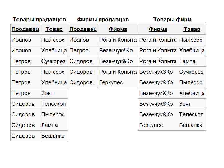Пример Продавец Иванов Петров Сидоров Сидоров Фирма Рога и Копыта Безенчук&Ко Безенчук&Ко Рога и Копыта Геркулес Товар Пылесос Хлебница Сучкорез Пылесос Хлебница Зонт Пылесос Телескоп Пылесос Лампа Вешалка
