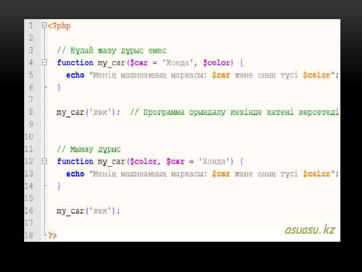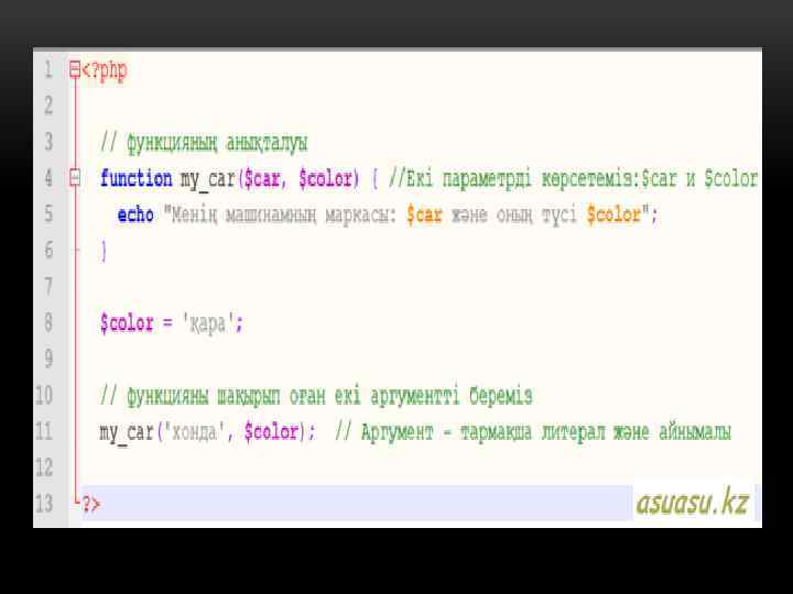 АРГУМЕНТТЕР ҚАЛАЙ БЕРІЛЕДІ. • PHP функцияларға аргументті үш түрде жібере алады. • 1. Аргументке мән беру арқылы (үнсіздік бойынша), яғни функцияның ішінде параметрдің мәні өзгертілсе де сырттағы мәні сол күйінде өзгеріссіз қала береді.
