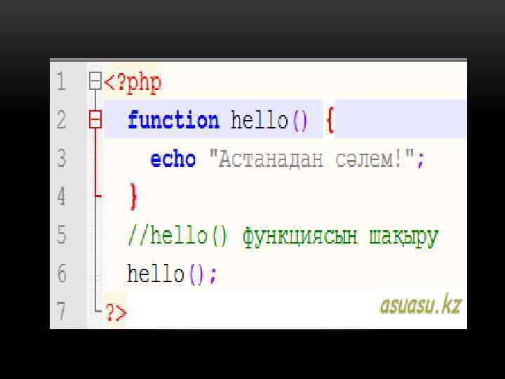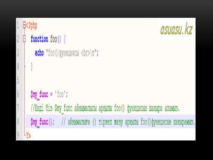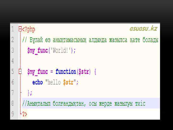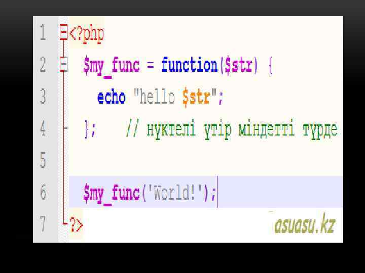 ЖАСЫРЫН ФУНКЦИЯ. • PHP да жасырын функция анықтауға болады. Олай аталатын себебіолардың атауы болмайды. Жасырын функцияларды кәдімгі мән сияқты анықтап, айнымалыларға теңестіруге болады: