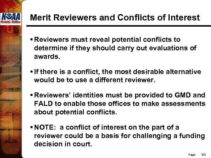 Merit Reviewers and Conflicts of Interest § Reviewers must reveal potential conflicts to determine if they should carry out evaluations of awards. § If there is a conflict, the most desirable alternative would be to use a different reviewer. § Reviewers’ identities must be provided to GMD and FALD to enable those offices to make assessments about potential conflicts. § NOTE: a conflict of interest on the part of a reviewer could be a basis for challenging a funding decision in court. Page 100