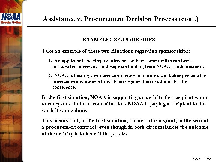 Assistance v. Procurement Decision Process (cont. ) EXAMPLE: SPONSORSHIPS Take an example of these two situations regarding sponsorships: 1. An applicant is hosting a conference on how communities can better prepare for hurricanes and requests funding from NOAA to administer it. 2. NOAA is hosting a conference on how communities can better prepare for hurricanes and awards funds to an organization to administer the conference. In the first situation, NOAA is supporting an activity the recipient wants to carry out. In the second situation, NOAA is paying a recipient to do work it wants done. This means that, in the first situation, the award is a grant, in the second a procurement contract, even though in both circumstances the outcome of the activity is to benefit the public. Page 106