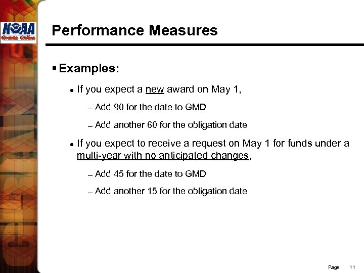 Performance Measures Rule of Thumb § Timing is estimated based on expected receipt of application or start date. § GMD never gets more than 60 days to review and process an application. § Applications are signed 30 days before start date. § Measures depend on the type of grant. l Program Offices have 90 days to process New Awards, and GMD has 60. l Program Offices have 75 days to process Continuations, and GMD has 45. l Program Offices have 45 days to process multi-year releases without changes, and GMD has 15. Page 10