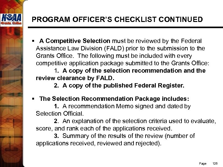 PROGRAM OFFICER’S CHECKLIST CONTINUED § A Competitive Selection must be reviewed by the Federal Assistance Law Division (FALD) prior to the submission to the Grants Office. The following must be included with every competitive application package submitted to the Grants Office: 1. A copy of the selection recommendation and the review clearance by FALD. 2. A copy of the published Federal Register. § The Selection Recommendation Package includes: 1. A recommendation Memo signed and dated by Selection Official. 2. An explanation of the selection criteria used to evaluate, score, and rank each of the applications received. 3. Summary of the results of the review (number of applications received, reviewed and rejected). Page 126