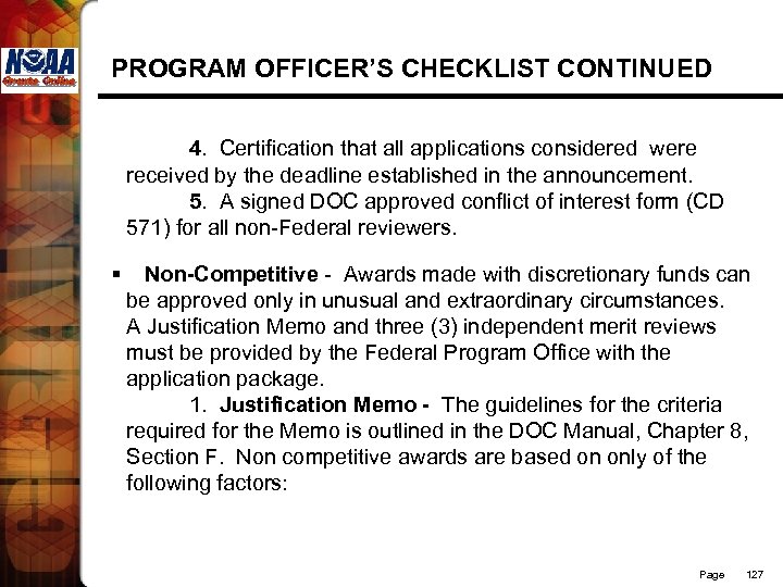 PROGRAM OFFICER’S CHECKLIST CONTINUED 4. Certification that all applications considered were received by the deadline established in the announcement. 5. A signed DOC approved conflict of interest form (CD 571) for all non-Federal reviewers. § Non-Competitive - Awards made with discretionary funds can be approved only in unusual and extraordinary circumstances. A Justification Memo and three (3) independent merit reviews must be provided by the Federal Program Office with the application package. 1. Justification Memo - The guidelines for the criteria required for the Memo is outlined in the DOC Manual, Chapter 8, Section F. Non competitive awards are based on only of the following factors: Page 127