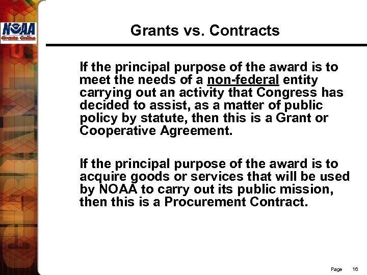What is Financial Assistance? Grant/Cooperative Agreement – a transfer of money, property, services or anything of value to a recipient in order to accomplish a public purpose of support or stimulation that is authorized by federal statute. Contract – a legal instrument reflecting a relationship between NOAA and a business, organization, or individual whenever the principal purpose is the acquisition, by purchase, lease or barter, of property or services for the direct benefit or use by the federal government. Page 15