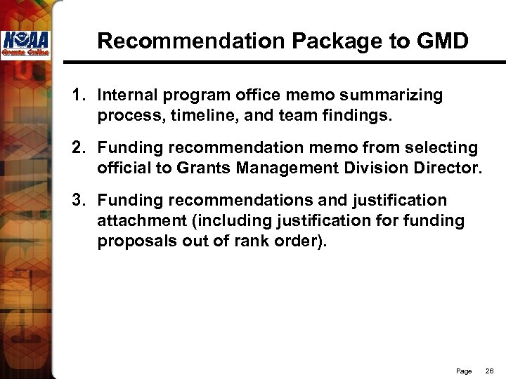 Recommendation Package to GMD 1. Internal program office memo summarizing process, timeline, and team findings. 2. Funding recommendation memo from selecting official to Grants Management Division Director. 3. Funding recommendations and justification attachment (including justification for funding proposals out of rank order). Page 26