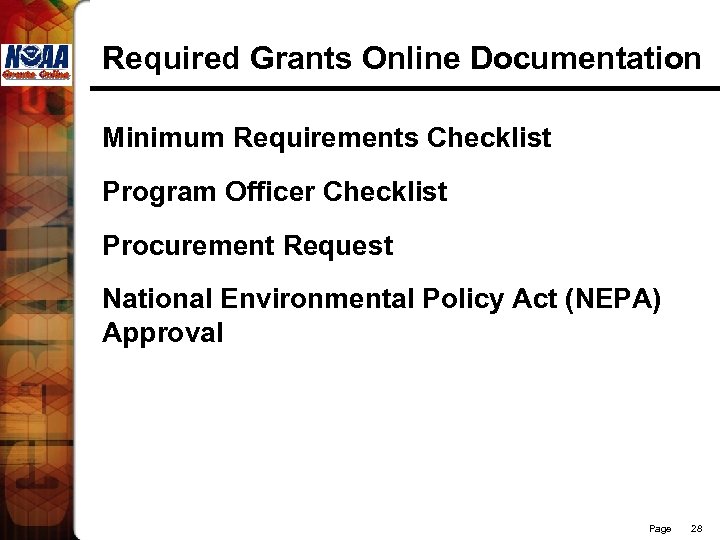 Required Grants Online Documentation Minimum Requirements Checklist Program Officer Checklist Procurement Request National Environmental Policy Act (NEPA) Approval Page 28