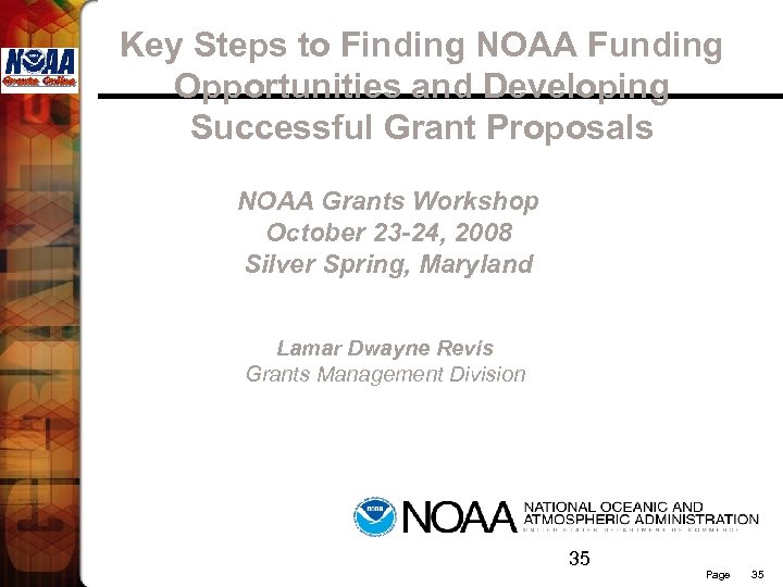 Key Steps to Finding NOAA Funding Opportunities and Developing Successful Grant Proposals NOAA Grants Workshop October 23 -24, 2008 Silver Spring, Maryland Lamar Dwayne Revis Grants Management Division 35 Page 35