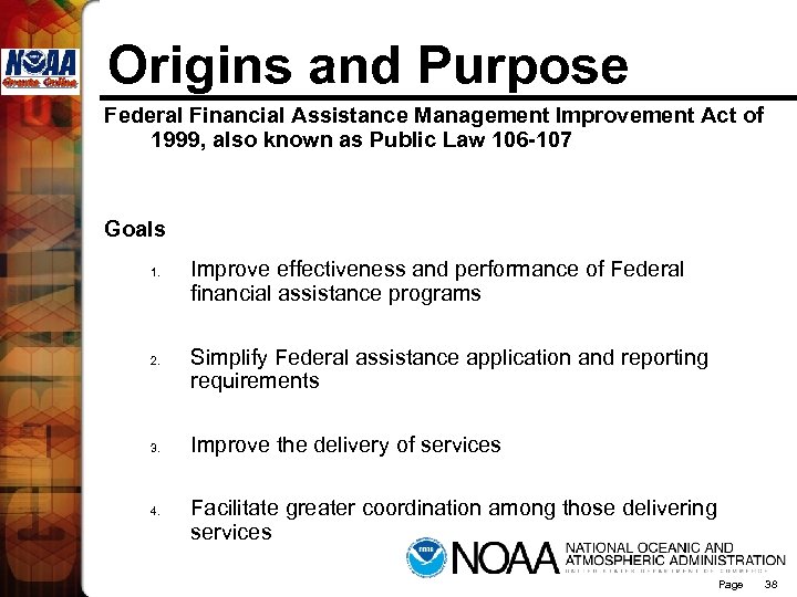 Origins and Purpose Federal Financial Assistance Management Improvement Act of 1999, also known as Public Law 106 -107 Goals 1. 2. 3. 4. Improve effectiveness and performance of Federal financial assistance programs Simplify Federal assistance application and reporting requirements Improve the delivery of services Facilitate greater coordination among those delivering services Page 38