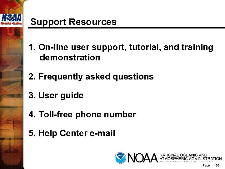 Support Resources 1. On-line user support, tutorial, and training demonstration 2. Frequently asked questions 3. User guide 4. Toll-free phone number 5. Help Center e-mail Page 39
