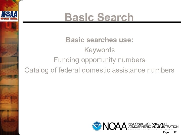 Basic Search Basic searches use: Keywords Funding opportunity numbers Catalog of federal domestic assistance numbers Page 42