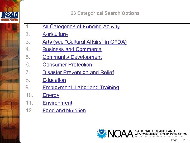 23 Categorical Search Options 1. 2. 3. 4. 5. 6. 7. 8. 9. 10. 11. 12. All Categories of Funding Activity Agriculture Arts (see "Cultural Affairs" in CFDA) Business and Commerce Community Development Consumer Protection Disaster Prevention and Relief Education Employment, Labor and Training Energy Environment Food and Nutrition Page 45