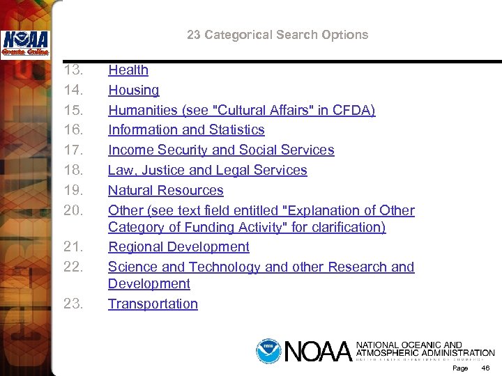 23 Categorical Search Options 13. 14. 15. 16. 17. 18. 19. 20. 21. 22. 23. Health Housing Humanities (see "Cultural Affairs" in CFDA) Information and Statistics Income Security and Social Services Law, Justice and Legal Services Natural Resources Other (see text field entitled "Explanation of Other Category of Funding Activity" for clarification) Regional Development Science and Technology and other Research and Development Transportation Page 46