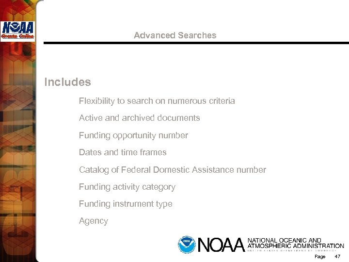 Advanced Searches Includes Flexibility to search on numerous criteria Active and archived documents Funding opportunity number Dates and time frames Catalog of Federal Domestic Assistance number Funding activity category Funding instrument type Agency Page 47