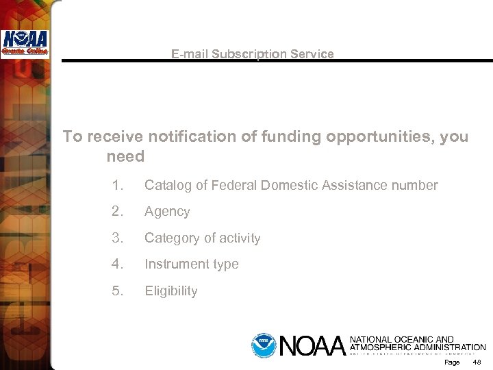 E-mail Subscription Service To receive notification of funding opportunities, you need 1. Catalog of Federal Domestic Assistance number 2. Agency 3. Category of activity 4. Instrument type 5. Eligibility Page 48