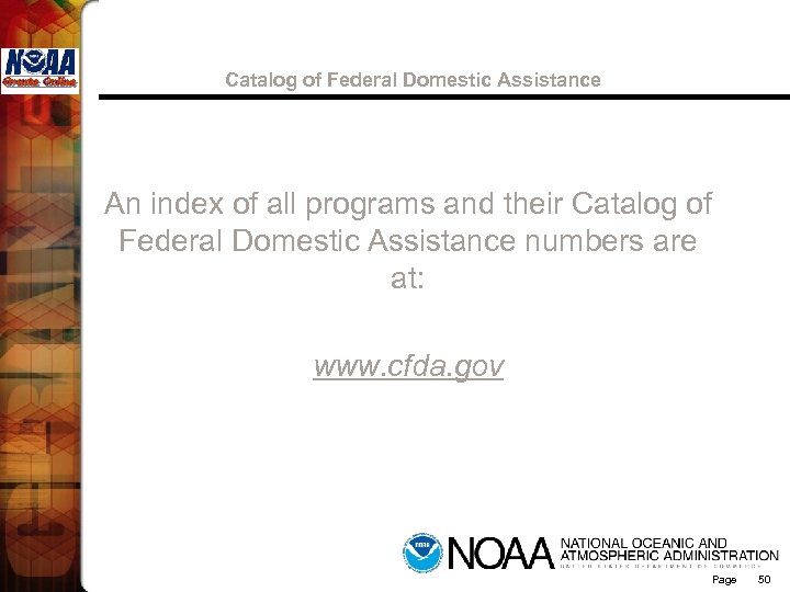 Catalog of Federal Domestic Assistance An index of all programs and their Catalog of Federal Domestic Assistance numbers are at: www. cfda. gov Page 50