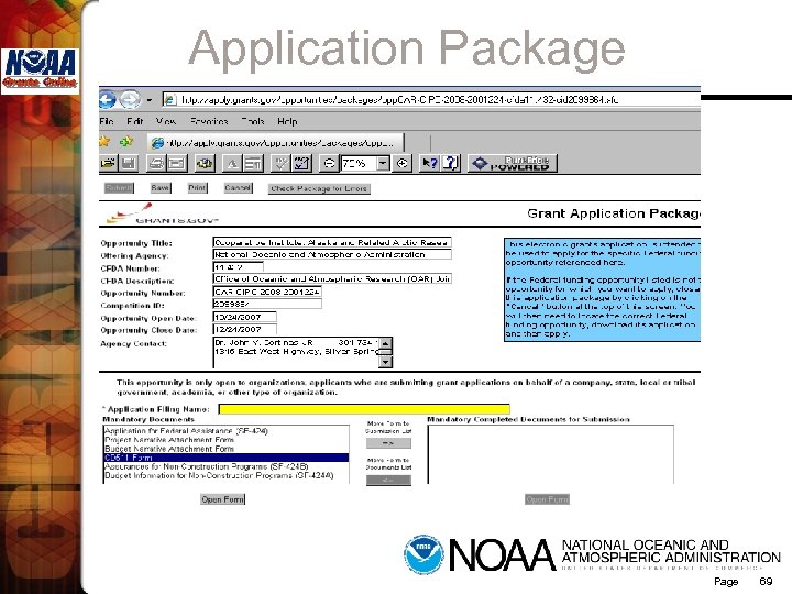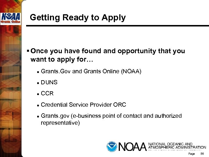 Getting Ready to Apply § Once you have found and opportunity that you want to apply for… l Grants. Gov and Grants Online (NOAA) l DUNS l CCR l Credential Service Provider ORC l Grants. gov (e-business point of contact and authorized representative) Page 56