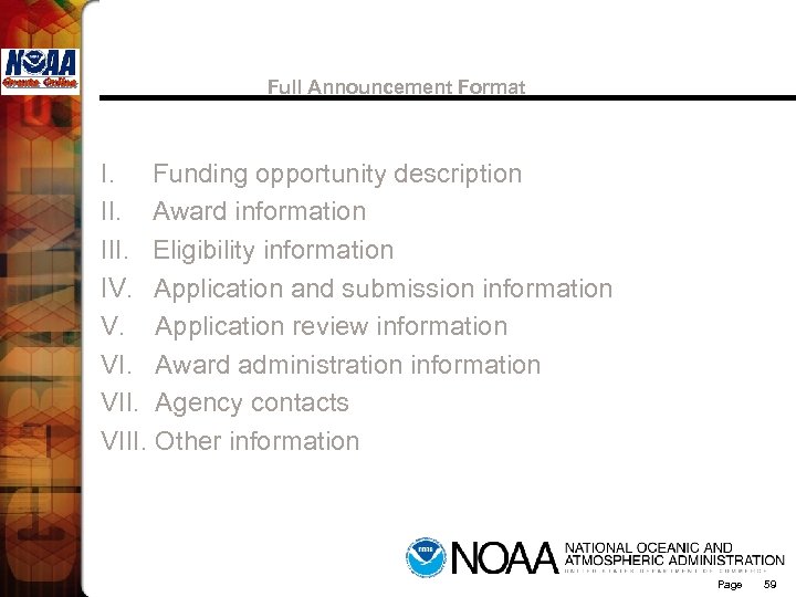 Full Announcement Format I. Funding opportunity description II. Award information III. Eligibility information IV. Application and submission information V. Application review information VI. Award administration information VII. Agency contacts VIII. Other information Page 59