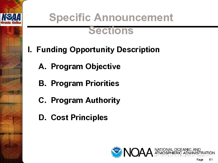 Specific Announcement Sections I. Funding Opportunity Description A. Program Objective B. Program Priorities C. Program Authority D. Cost Principles Page 61