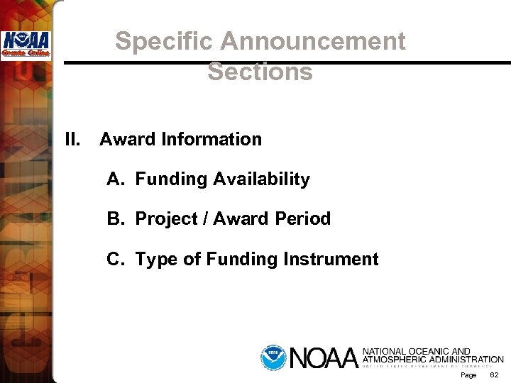 Specific Announcement Sections II. Award Information A. Funding Availability B. Project / Award Period C. Type of Funding Instrument Page 62