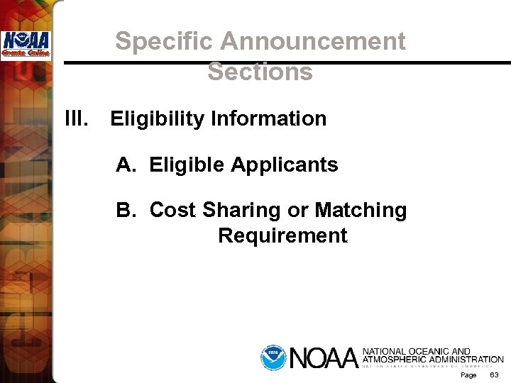Specific Announcement Sections III. Eligibility Information A. Eligible Applicants B. Cost Sharing or Matching Requirement Page 63