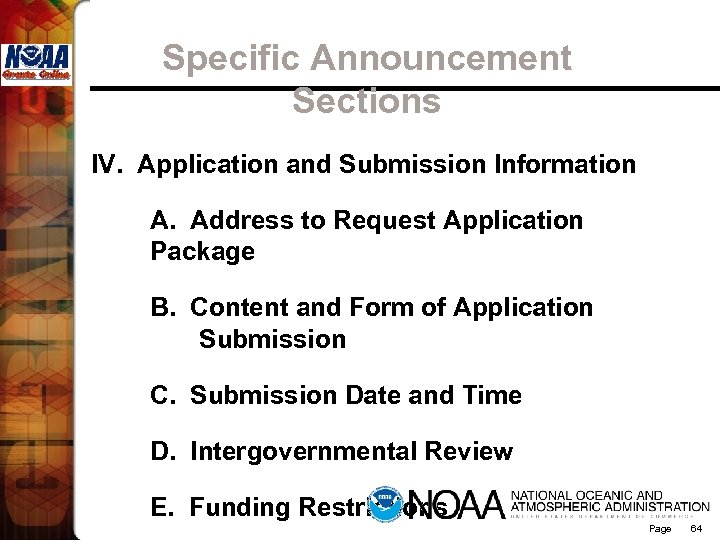 Specific Announcement Sections IV. Application and Submission Information A. Address to Request Application Package B. Content and Form of Application Submission C. Submission Date and Time D. Intergovernmental Review E. Funding Restrictions Page 64