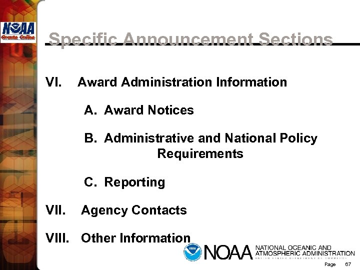 Specific Announcement Sections VI. Award Administration Information A. Award Notices B. Administrative and National Policy Requirements C. Reporting VII. Agency Contacts VIII. Other Information Page 67