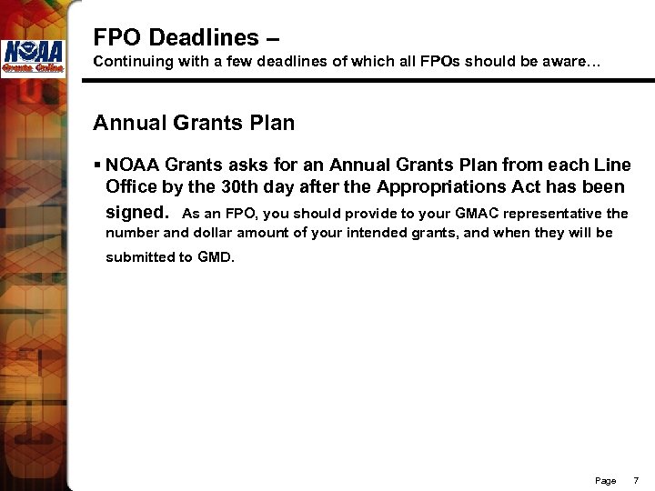 FPO Deadlines – There a few deadlines of which all FPOs should be aware… June 30 § Guaranteed processing if submitted by June 30. NOAA Grants (GMD) accepts grant applications from Federal Program Officers (FPO) throughout the year. Since GMD only guarantees processing and obligation for those grant applications that are sent to GMD by June 30, NOAA managers want all grant applications prepared and sent to GMD by June 30. § After June 30, notify your GMD specialist, GMAC rep, and Budget Officer for their carry-over list. If you, as an FPO, know that your grant application will be sent to GMD after June 30, you should contact your GMD specialist and your Grants Management Advisory Committee (GMAC) representative with this information. You should also provide your budget officer with the project codes and dollar amount for the grant. Your budget officer will include them on a carry-over list which gets submitted to NMFS Budget Execution Office. Corrections and updates to the carry-over list can be made throughout the 4 th quarter by your budget officer. Page 6