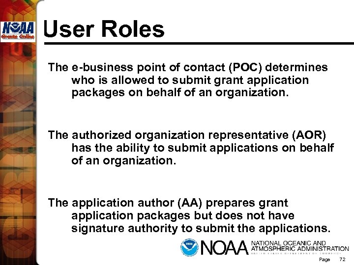 User Roles The e-business point of contact (POC) determines who is allowed to submit grant application packages on behalf of an organization. The authorized organization representative (AOR) has the ability to submit applications on behalf of an organization. The application author (AA) prepares grant application packages but does not have signature authority to submit the applications. Page 72