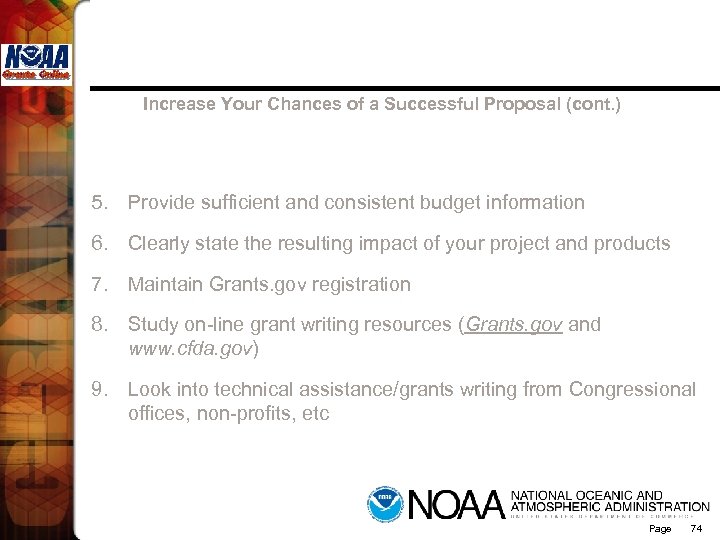 Increase Your Chances of a Successful Grant Proposal 1. Anticipate federal announcements of major competitions 2. NOAA typically announces every June and December 3. Follow and address submission guidance stated in announcements 4. Pay close attention to FFO Sections IV and V: - Section IV content and form of application - Section V application review information (used verbatim by merit review panel) Page 73