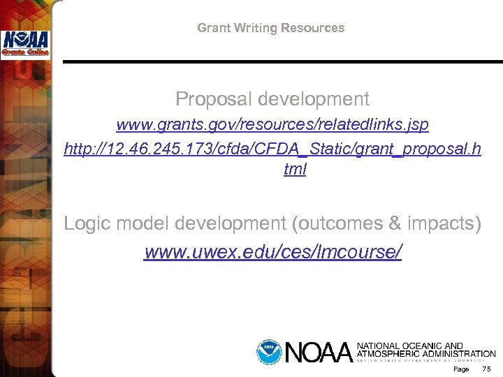 Grant Writing Resources Proposal development www. grants. gov/resources/relatedlinks. jsp http: //12. 46. 245. 173/cfda/CFDA_Static/grant_proposal. h tml Logic model development (outcomes & impacts) www. uwex. edu/ces/lmcourse/ Page 75