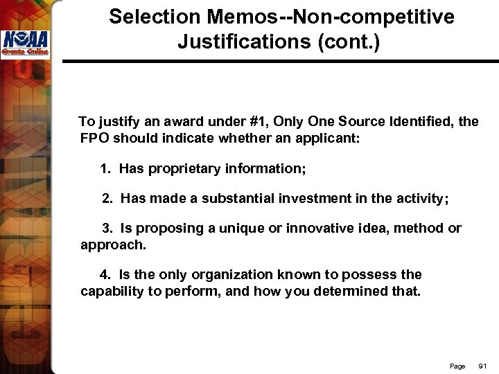 Selection Memos – Broad Agency Announcement (BAA) (cont. ) § DO NOT WRITE: “This project received good reviews and meets a NOAA mission. ” A great number of BAA award justifications have used essentially that language. § DO NOT USE non-competitive justifications for BAA awards. § INSTEAD: Explain why the program office decided that this proposal is worth being funded. Since the decision is completely at NOAA’s discretion, a clear reason should be offered. Page 89