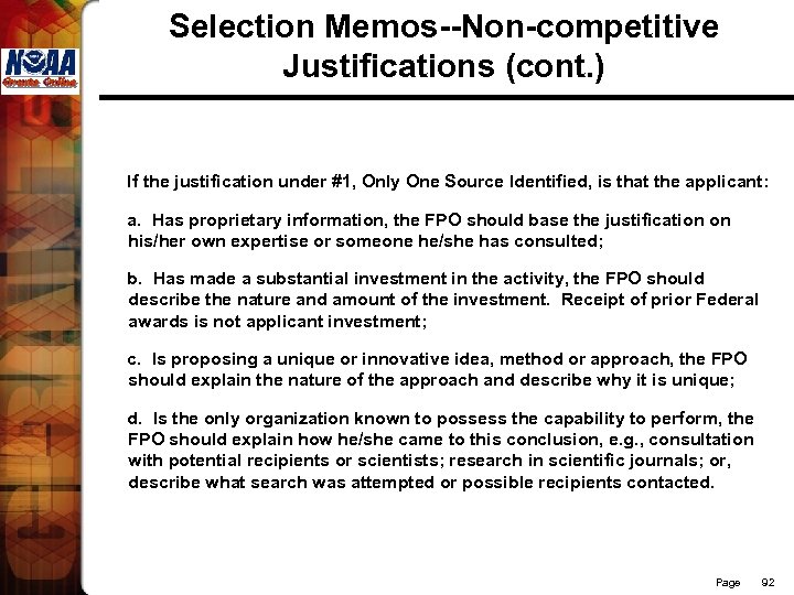 Selection Memos--Non-competitive Justifications (cont. ) To justify an award under #1, Only One Source Identified, the FPO should indicate whether an applicant: 1. Has proprietary information; 2. Has made a substantial investment in the activity; 3. Is proposing a unique or innovative idea, method or approach. 4. Is the only organization known to possess the capability to perform, and how you determined that. Page 91
