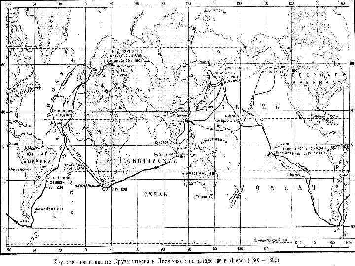 Маршрут первой русской кругосветной экспедиции. • Кронштадт (Россия) — Копенгаген (Дания) — Фалмут (Великобритания) — Санта-Крус-де-Тенерифе (Канарские острова, Испания) — Флорианополис (Бразилия, Португалия) — Остров Пасхи — Нукухива (Маркизские острова, Франция) — Гонолулу (Гавайские острова) — Петропавловск-Камчатский (Россия) — Нагасаки (Япония) — Хакодате (о-в Хоккайдо, Япония) — Южно-Сахалинск (о-в Сахалин, Россия) — Ситка (Аляска, Россия) — Кадьяк (Аляска, Россия) — Гуанчжоу (Китай) — Макао (Португалия) — остров Святой Елены (Великобритания) — о-ва Корву и Флориш (Азорские острова, Португалия) — Портсмут (Великобритания) — Кронштадт (Россия).
