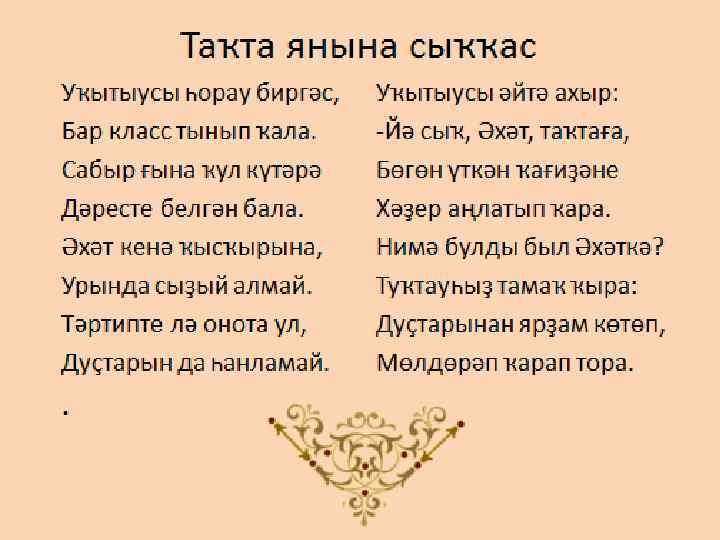 Таҡта янына сыҡҡас Уҡытыусы һорау биргәс, Бар класс тынып ҡала. Сабыр ғына ҡул күтәрә Дәресте белгән бала. Әхәт кенә ҡысҡырына, Урында сыҙый алмай. Тәртипте лә онота ул, Дуҫтарын да һанламай. . Уҡытыусы әйтә ахыр: -Йә сыҡ, Әхәт, таҡтаға, Бөгөн үткән ҡағиҙәне Хәҙер аңлатып ҡара. Нимә булды был Әхәткә? Туҡтауһыҙ тамаҡ ҡыра: Дуҫтарынан ярҙам көтөп, Мөлдөрәп ҡарап тора.