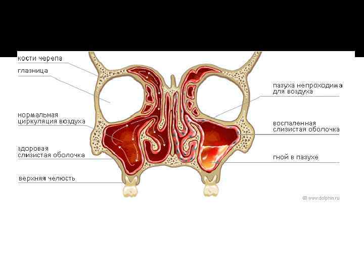 Объективно Отмечается припухлость тканей подглазничной области, нижнего века. Пальпация передней стенки верхней челюсти вызывает боль. Может изменяться чувствительность кожи в зоне иннервации подглазничным нервом. Носовое дыхание на пораженной стороне ослабленно, больные жалуются на зловонный запах. При передней риноскопии определяется гной в среднем носовом ходу, отёчность передних концов нижней и средней носовых раковин. При осмотре полости рта и рентгенологическом исследовании в области верхней челюсти на стороне поражённой пазухи выявляются зубы с осложнённым кариесом (верхушечный периодонтит, околокорневая киста), глубокий пародонтит или внутрикостный имплантант с признаками хронического воспалительного процесса вокруг него.