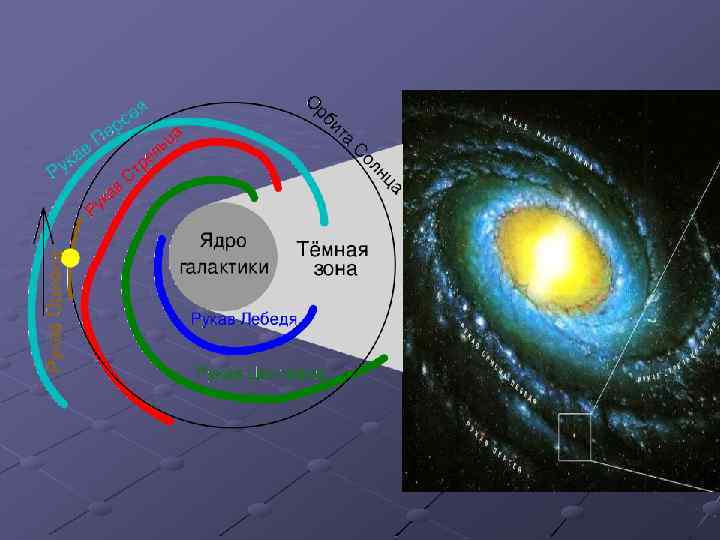 Сонце знаходиться між двома спіральними рукавами: рукавом Стрільця і рукавом Персея; відстань від Сонця до центру Галактики становить 22 -28 тис. світлових років, тобто Сонце посередині між центром і краєм диска; відносно найближчих зір Сонце рухається зі швидкістю 16 км/с у напрямку сузір’я Геркулес;